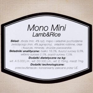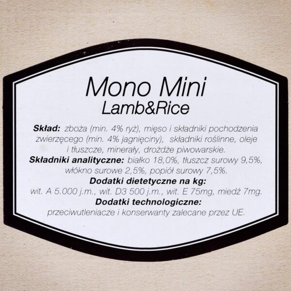 Ingrédients | Céréales (min. 4% de riz), viande et sous-produits animaux (min. 4% de farine d’agneau), dérivés d’origine végétale, huiles et graisses, minéraux, levure. |