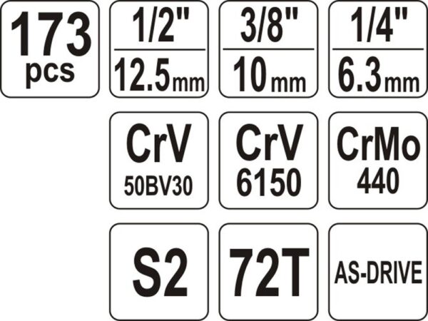 Contenu du coffret | Cliquet 1/2 » : 72T, L= 255 mm, cliquet 3/8 » : 72T, 200 mm, cliquet 1/4 » : 72T, 155 mm, bouton coulissant : 1/2« ; 1/4 », bouton tournevis 1/4 », L= 150 mm |